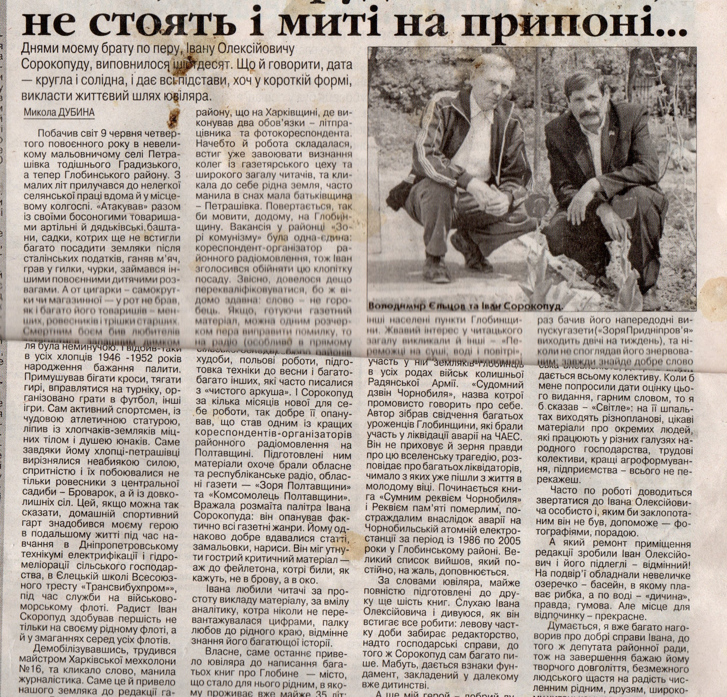 Стаття М.Дубни в обласній газеті "Село полтавське" про редактора районної газети "Зоря Придніпров'я" ІВАНА СОРОКОПУДА...